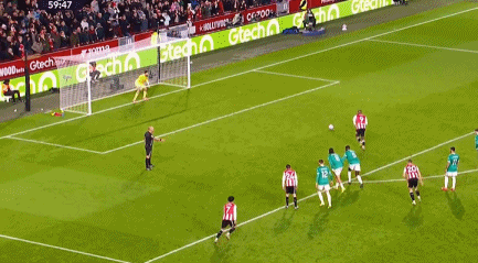 第58分钟,范戴克在禁区边际踢到瓦塔纳,不外裁判左证VAR指示认定在犯规场地在禁区线上,于是判罚点球。第60分钟,蒂亚戈操刀射中,布伦特福德扩大上风,3-1!