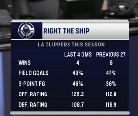 快船VS国王,转播方晒出快船往日四场和之前27场的数据对比: