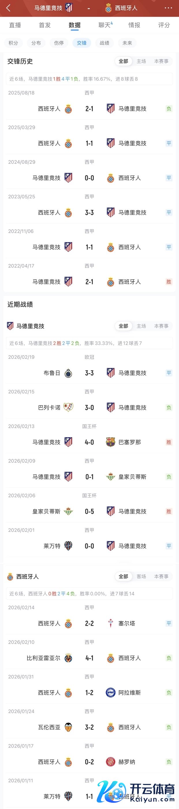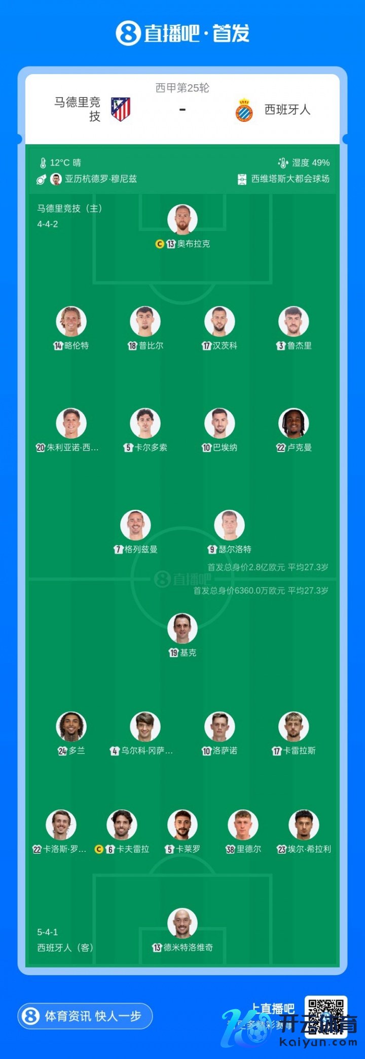 2月22日讯 北京期间2月22日日曜日04:00,西甲第25轮,马德里竞技主场迎战西班经纪东谈主,当今两边公布了本场比赛的首发声势。