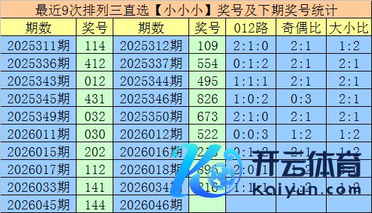 1.摆设三第2026045期奖号开出144,大小直选散布为:小小小,在历史开奖中直选【小小小】散布已开出954期,在前9次直选【小小小】散布中,出现奖号为:114-412-012-431-032-030-202-112-141,组三开出5期,组六开出4期。
