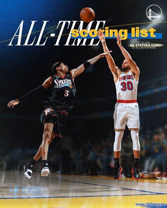 本场比赛,库里拿到26分,得分来到24371分,卓绝艾弗森(24368分),来到历史第28位。