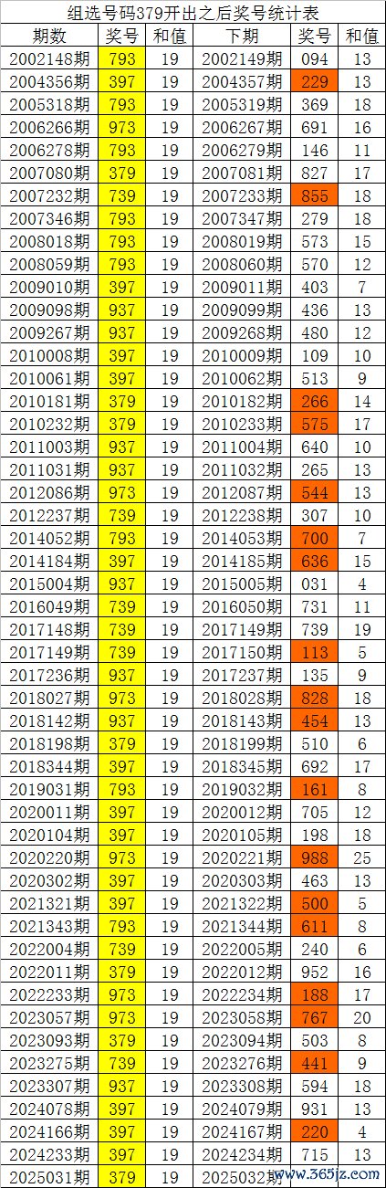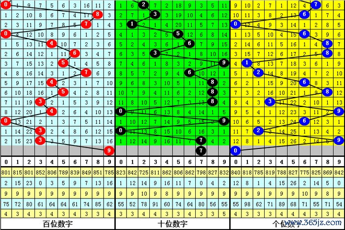 从以上统计不错看出,直选号码379出现之后,其下期奖号:1.下期大号出现概率100%;2.下期2路号码出现概率100%;3.下期质数出现概率100%;