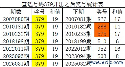 福彩3D第2025031期开出直选号码为:379,该直选号码历史上出现了7次,其下期远隔开出了号码:827、266、575、510、952、503,如图: