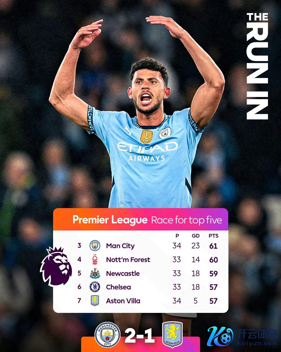 第94分钟,替补登场的多库左路暴力打破送助攻,努内斯推射绝杀。最终曼城2-1降服维拉,取得3连胜的同期完结了维拉5连胜,积61分升至英超第三,争夺欧冠经历抓有主动权。