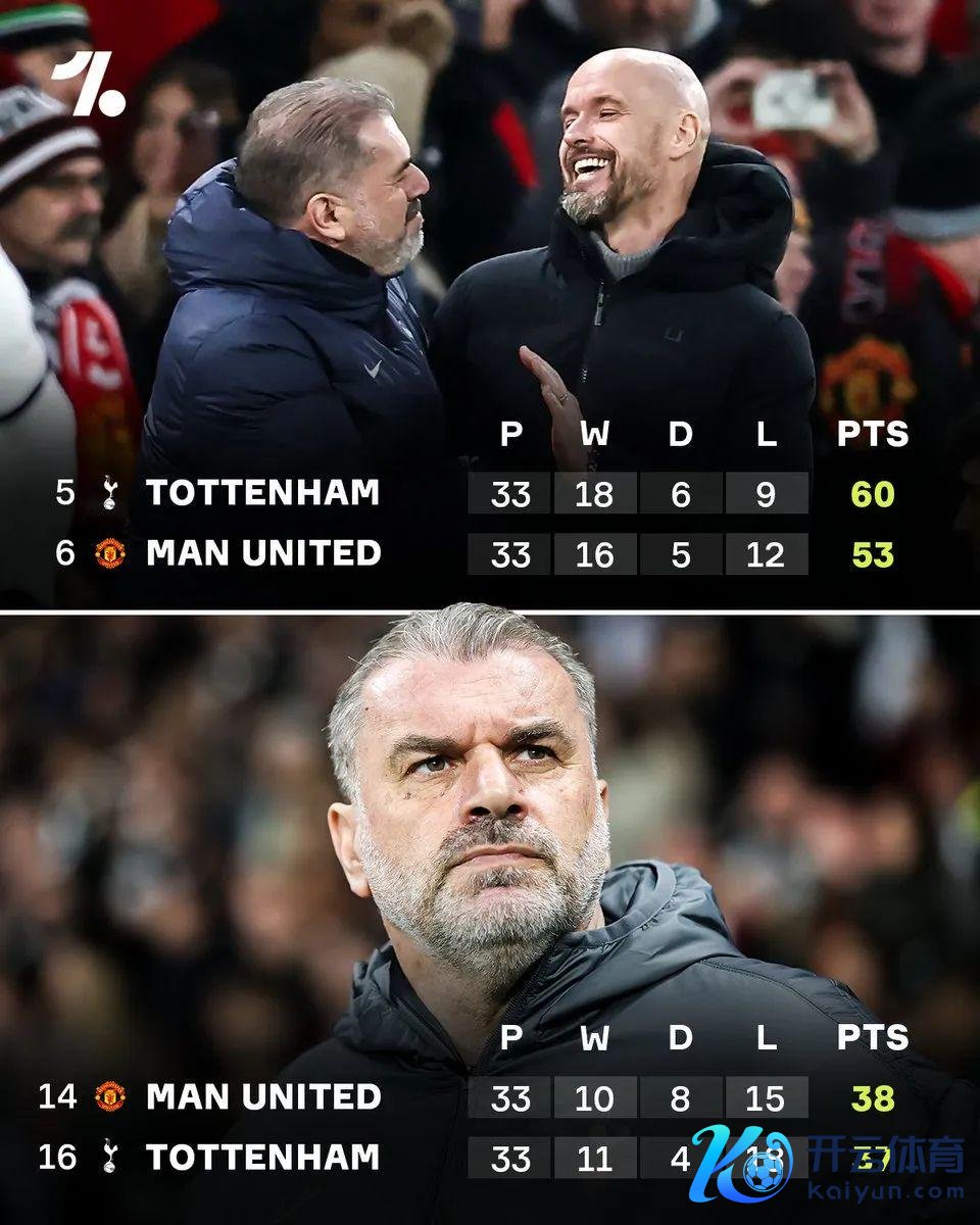 骨子上若是对比上赛季得益(热刺66分排第5,曼联60分排第8),热刺的衰退幅度显明比曼联还要更夸张。