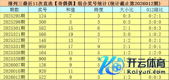 开奖纪念:摆设三第2026012期开出奖号:522,类型为组三,和值为9,奇偶比为1:2,大小比为1:2,跨度为3。