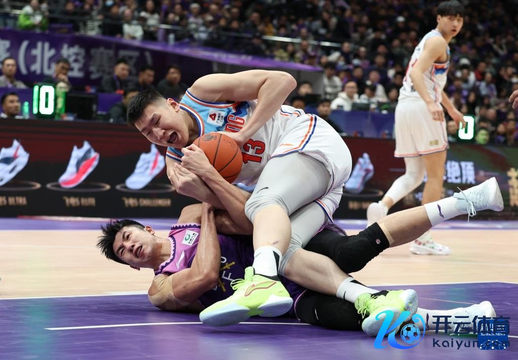 12月15日,新疆伊力特队球员李炎哲(上)与北京控股队球员邹雨宸倒地拼抢。新华社记者 王楷焱 摄