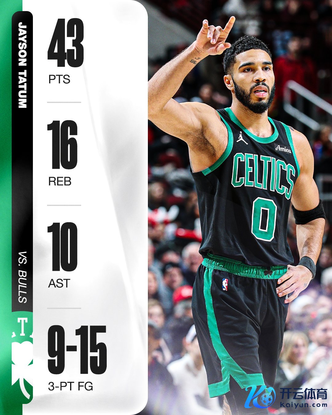 本场比赛,绿军球星塔图姆进展炸裂,他全场出战36分钟,24投16中,三分15中9,罚球2中2,爆砍43分16篮板10助攻大号三双,这亦然他活命第3次拿到三双,9记三分追平活命单场最高!