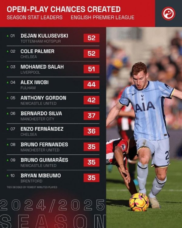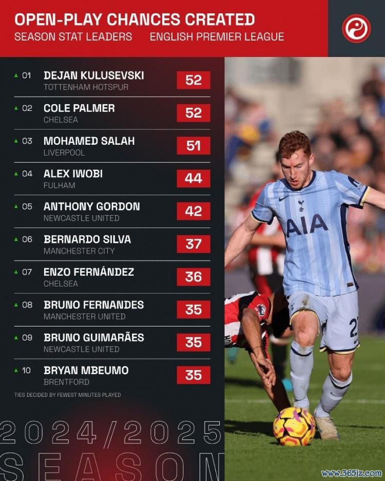 直播吧2月5日讯 squakwa统计了本赛季英超通顺战创造契机情况体育录像/图片,库卢、帕尔默和均跳动50次。