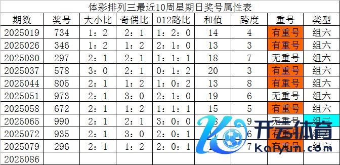 体彩胪列三最近10周日曜日奖号差别为:734、346、297、578、805、973、672、990、935、296,各奖号属性详见下表: