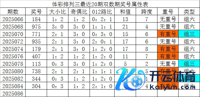 体彩胪列三最近20期双数期奖号差别为:184、975、771、935、179、407、113、738、344、304,各期奖号细心属性下表: