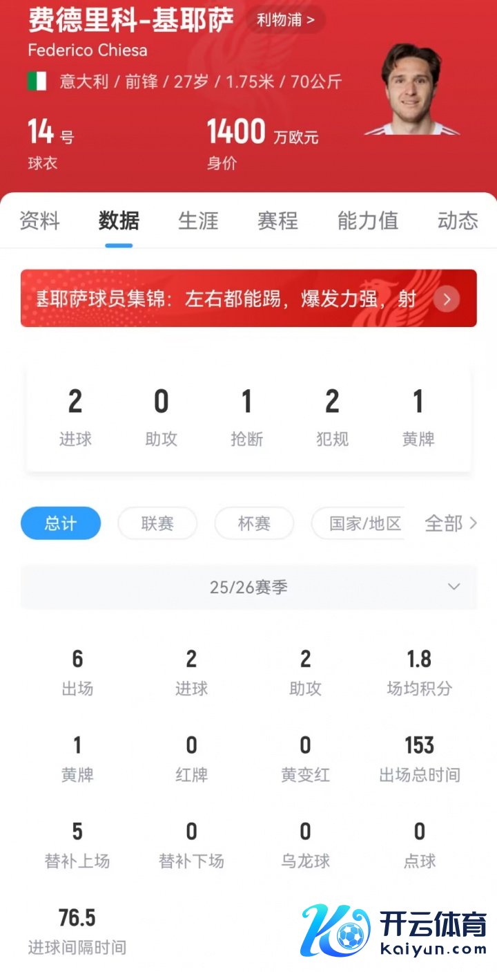 本赛季,基耶萨照旧为利物浦在各项赛事中出场6次,孝顺2球2助,现在的身价为1400万欧元。