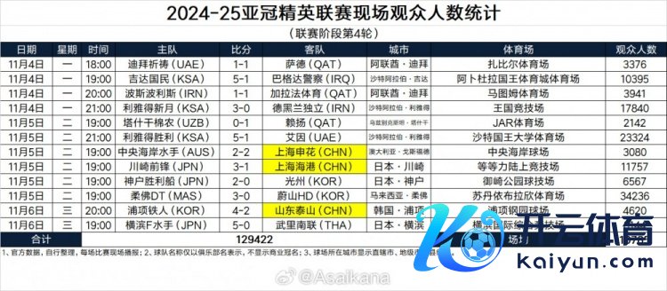 2024-25亚冠精英联赛现场不雅世东谈主数统计(联赛阶段第4轮)体育赛事直播