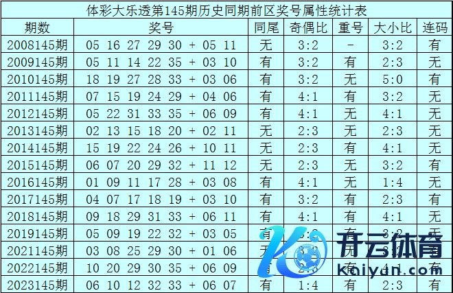 体彩大乐透第145期历史同时开出15次奖号,其统计详见下表: