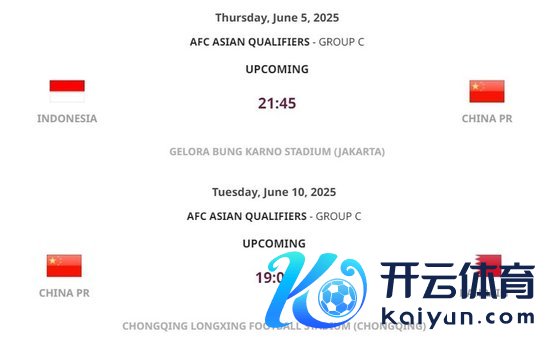 4月14日晚,亚足联官网更新了2026年寰宇杯亚洲区初赛十八强赛C组终末两轮比赛的开球时刻,其中6月5日中国男足客场对阵印度尼西亚队的比赛将于北京时刻21时45分开球,6月10日国足主场对阵巴林队的比赛则将于19时整开球。