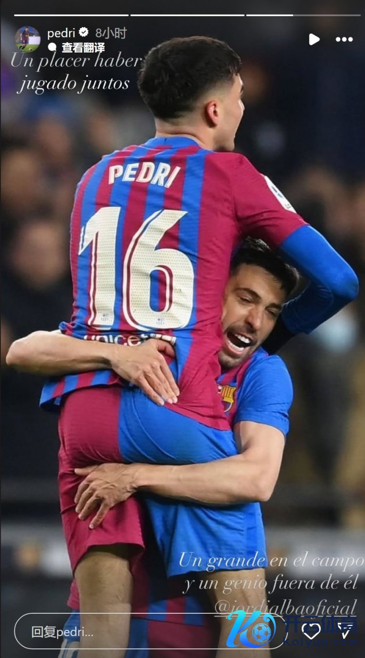 10月8日讯 阿尔巴晓谕将在本赛季散伙后退役,巴萨中场佩德里社媒发文致意。