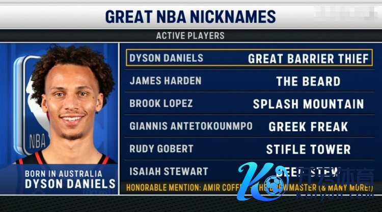 具体如下:戴森-丹尼尔斯:大闸窃贼哈登:大胡子大洛:水花大山字母哥:希腊怪兽戈贝尔:销毁之塔斯图尔特:蛮牛斯图 体育最新信息