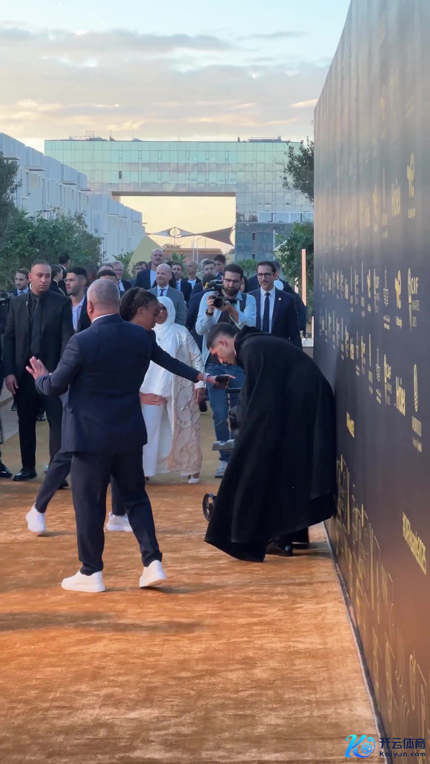 因为脚踝受伤,阿什拉夫前去受奖仪式时带着助行器,他穿着黑披风借着助行器行走,拍照和领奖时连蹦带跳。