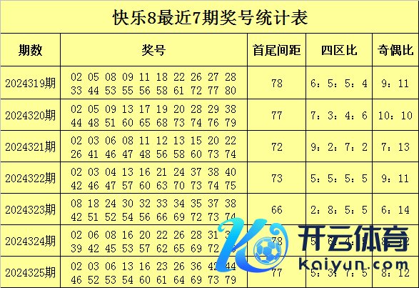福彩景观8第2024325期开出奖号:02 03 06 13 16 23 26 36 42 44 46 52 53 54 60 61 64 69 73 79,其中奖奇偶比8:12体育最新信息,四区比为5:3:7:5,跨度为:77。