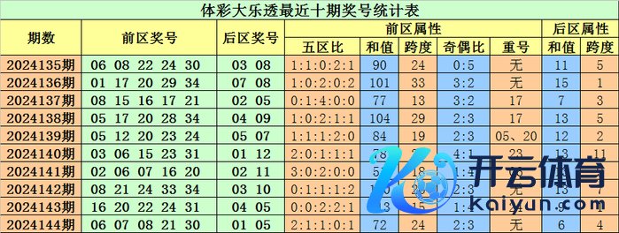 上期开奖:体彩大乐透第2024144期开奖号码为:06、07、08、21、30+01、05。前区五区比为2:1:1:0:1,和值为72,首尾间距为24,奇偶比为2:3,无重号。后区号码和值为6,跨度为4。