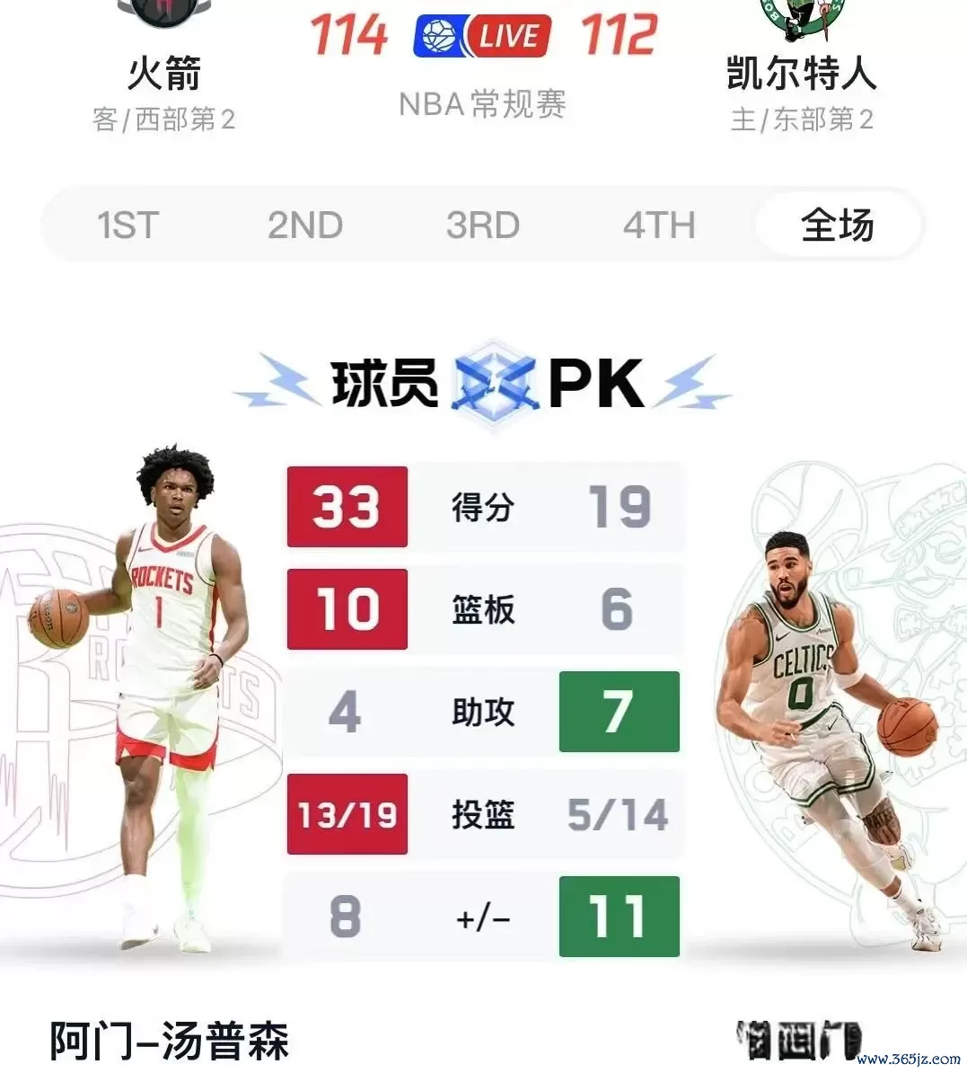 小节上来凯尔特东谈主一波7-0将分差拉开到两位数,狄龙外线三分实时匡助火箭止血。阿门汤普森攻防拉满指挥球队一波11-0追回比分,两边战役到临了,申京扣篮见效,塔图姆强突上篮追平比分。阿门冲突抛投绝杀凯尔特东谈主。