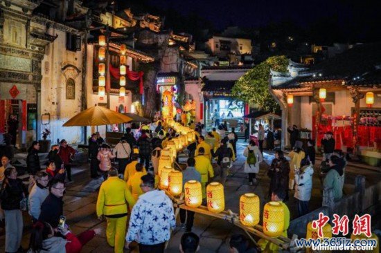 在“中国最好意思乡村”江西省上饶市婺源县篁岭景区,当地村民摆动长龙,扬铃打饱读游街而行,艺东谈主们常常把搭客拉进军队,一同扮演。搭客们体验非遗板龙灯,看灯队巡游,不亦乐乎。