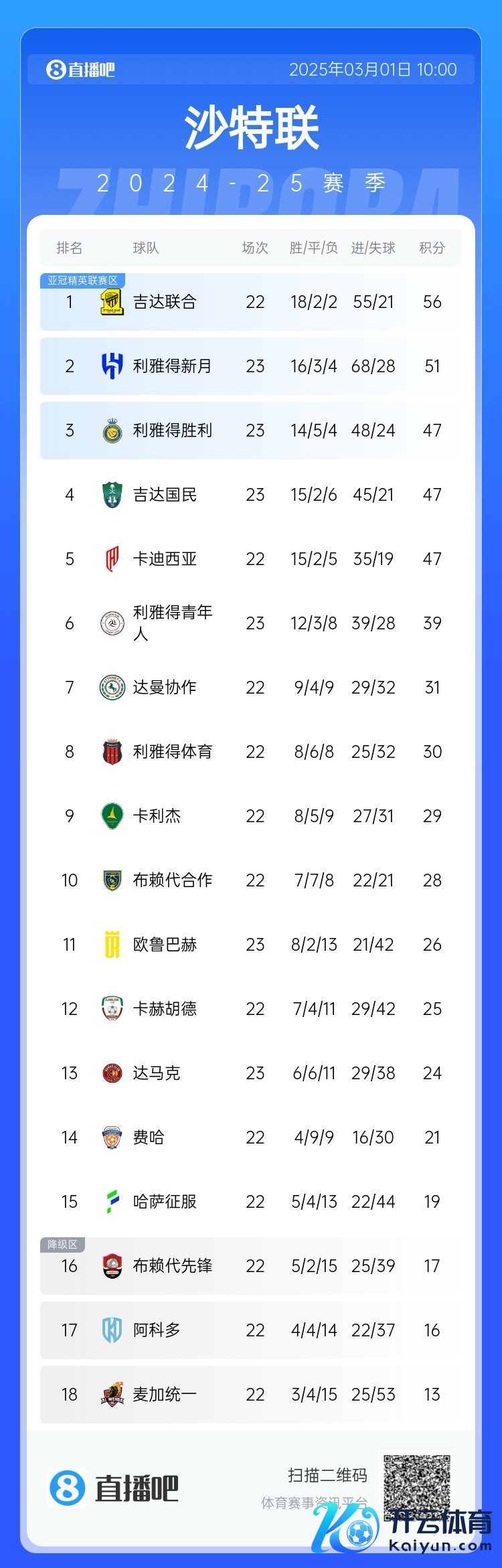 沙特联积分榜,吉达连合本轮未赛5分领跑体育最新信息,利雅得月牙排第二,利雅得告捷、吉达国民、卡迪西亚(少赛)同分。