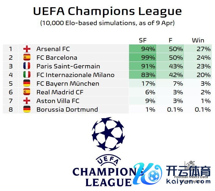 04月10日讯 欧冠1/4决赛首回合战罢,数据机构Football Meets Data通过1万次模拟得出了最新的8强晋级以及夺冠概率。